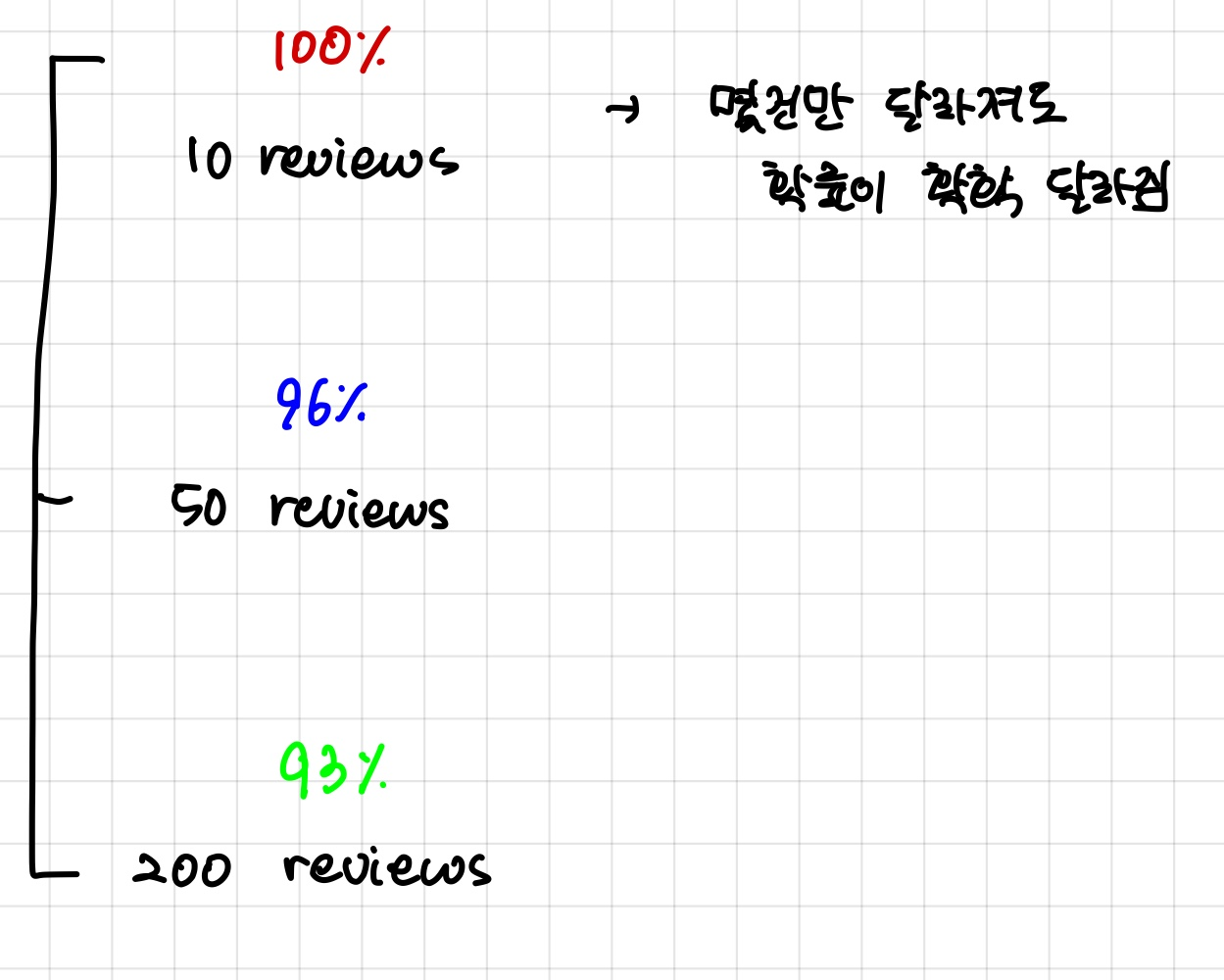 원래는 10개중에 10개의 리뷰 모두 100%였다면,