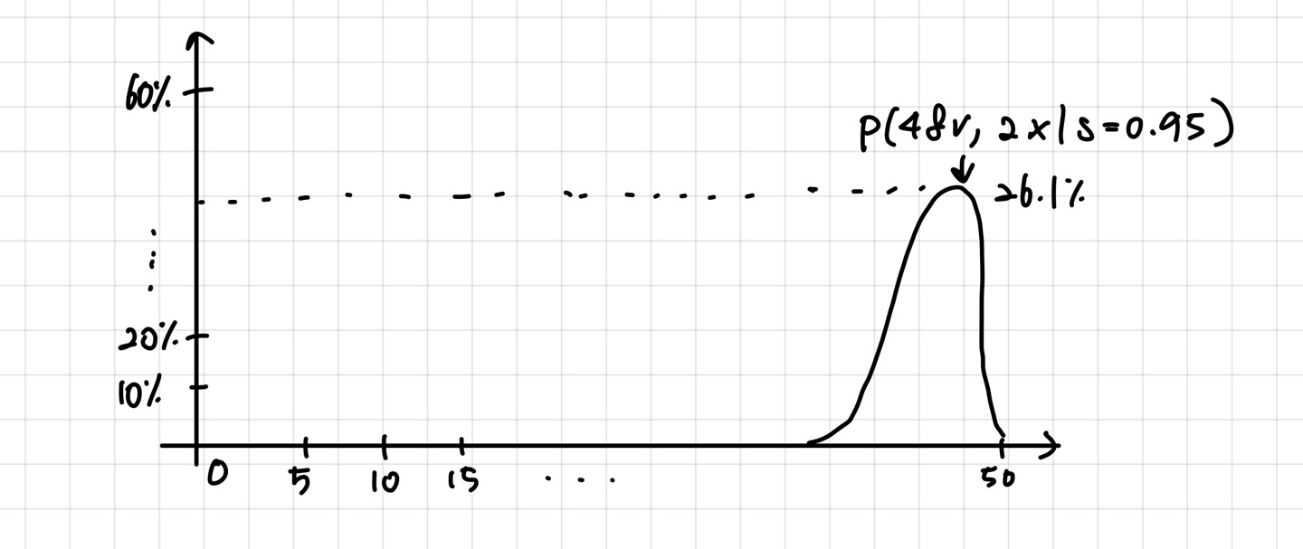 50개중에 랜덤으로 48개를 택하고, s가 맞을 확률인 0.95와 아닐 확률 1-0.95에 각각의 개수를 제곱하여 곱해줍니다.